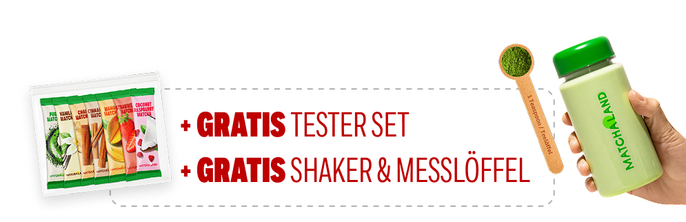 Nur für kurze Zeit bekommst du auf das Matcha Premium Starter-Set 41% Rabatt und erhältst zusätzlich gratis ein Tester-Set mit 7 Geschmacksrichtungen + einen Shaker mit Messlöffel dazu.